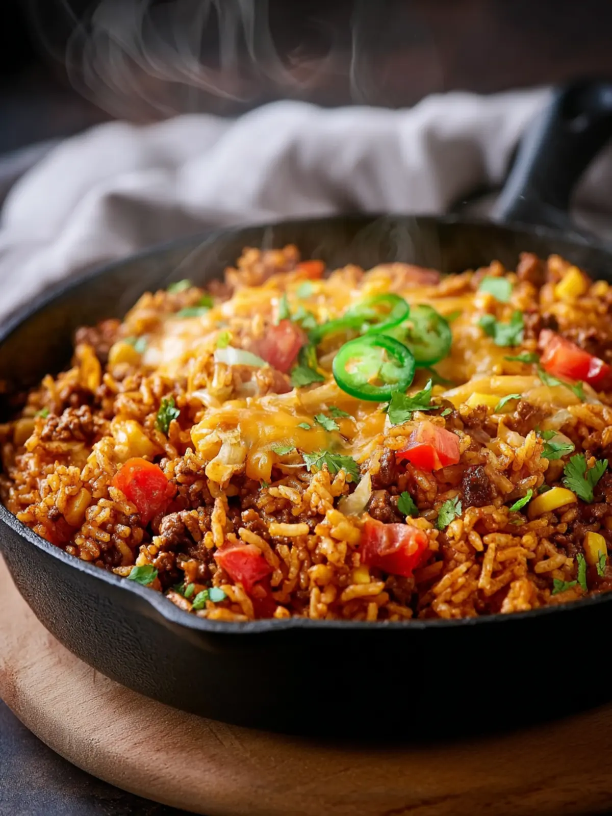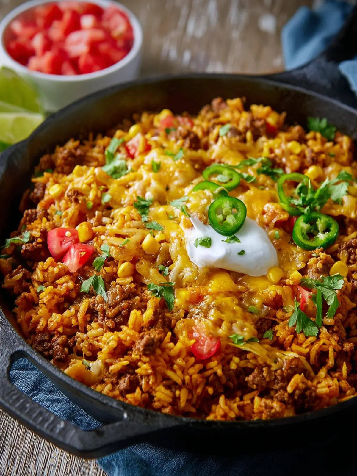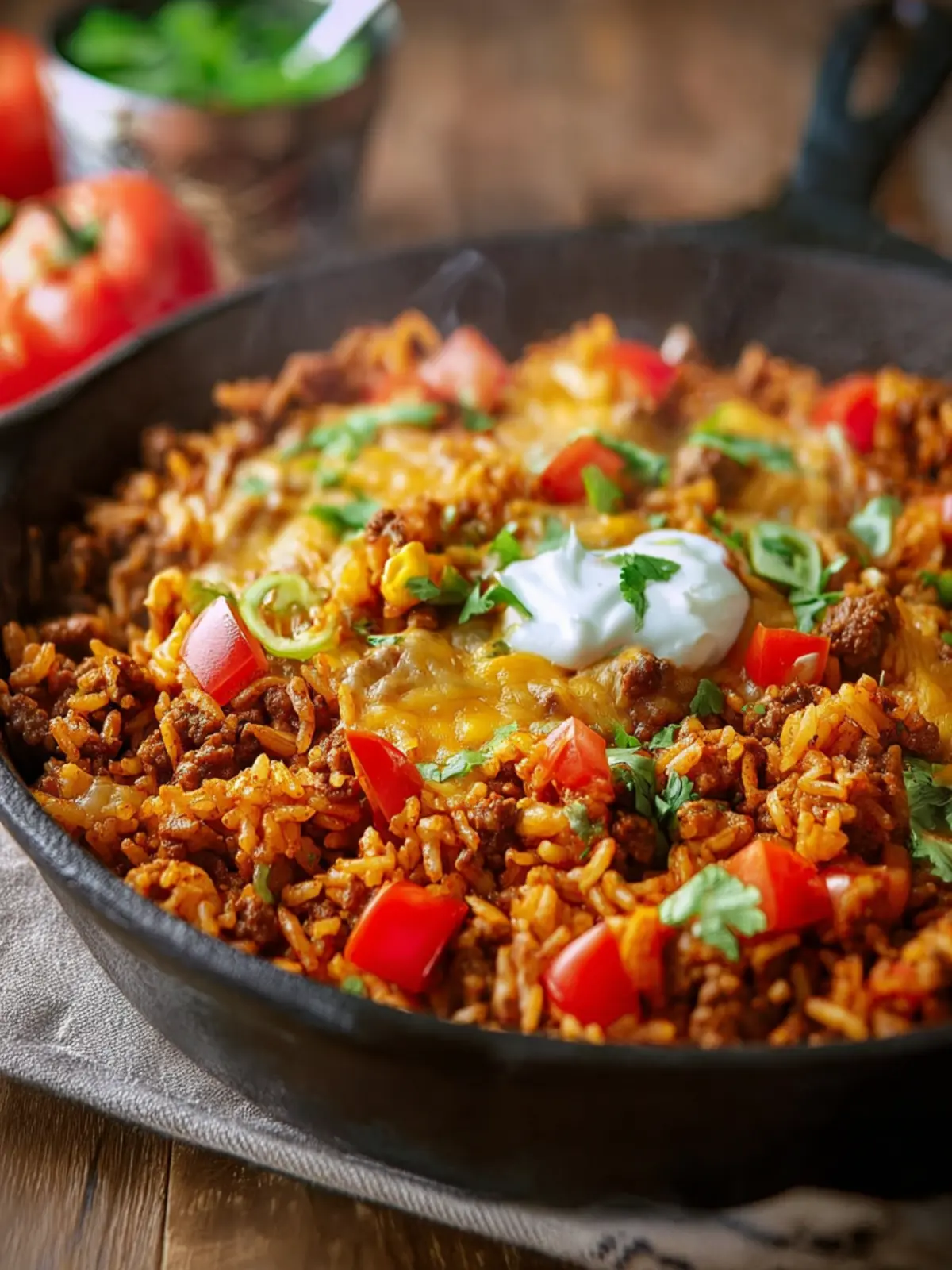 A delicious and easy Taco Rice Skillet recipe that combines ground beef, rice, and cheese for a quick weeknight meal.
