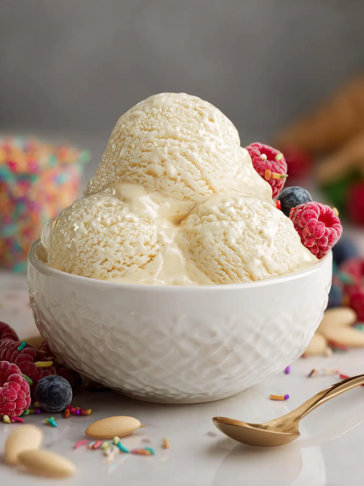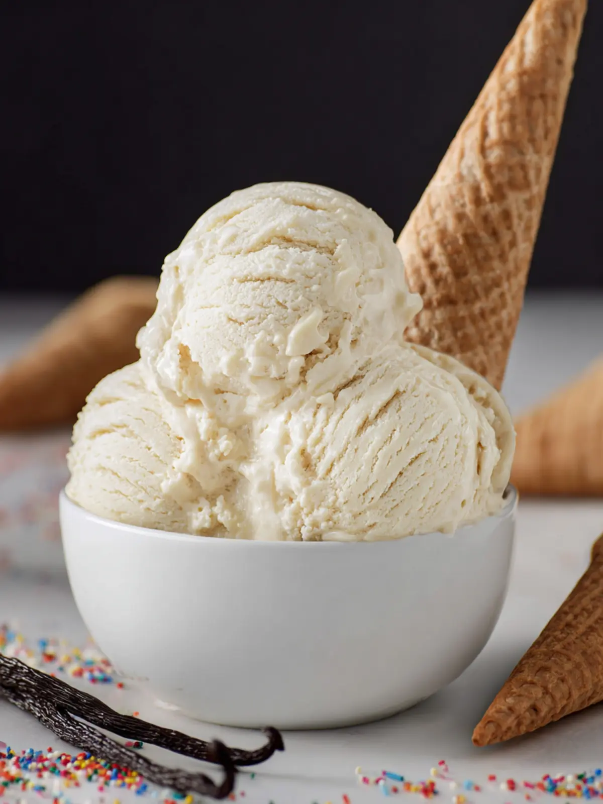 This creamy vanilla ice cream is made with eggs, sugar, and rich cream, perfect for any dessert lover.