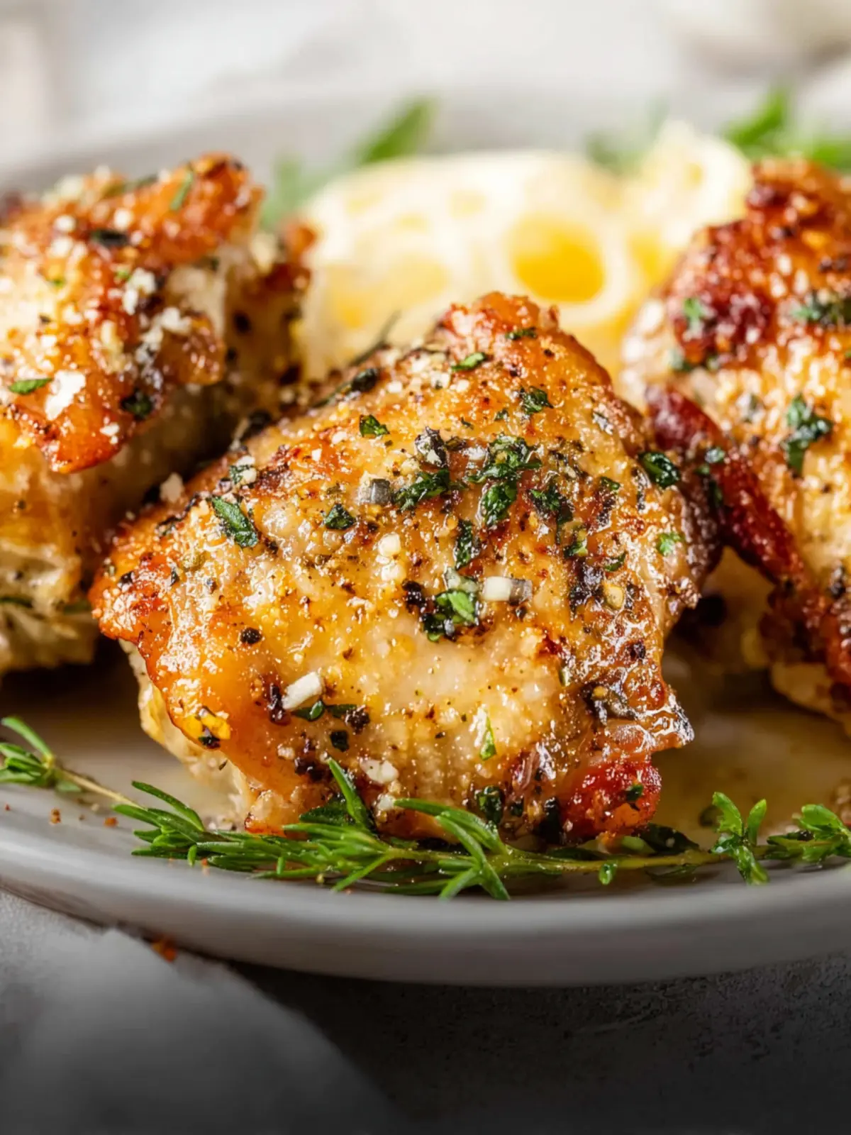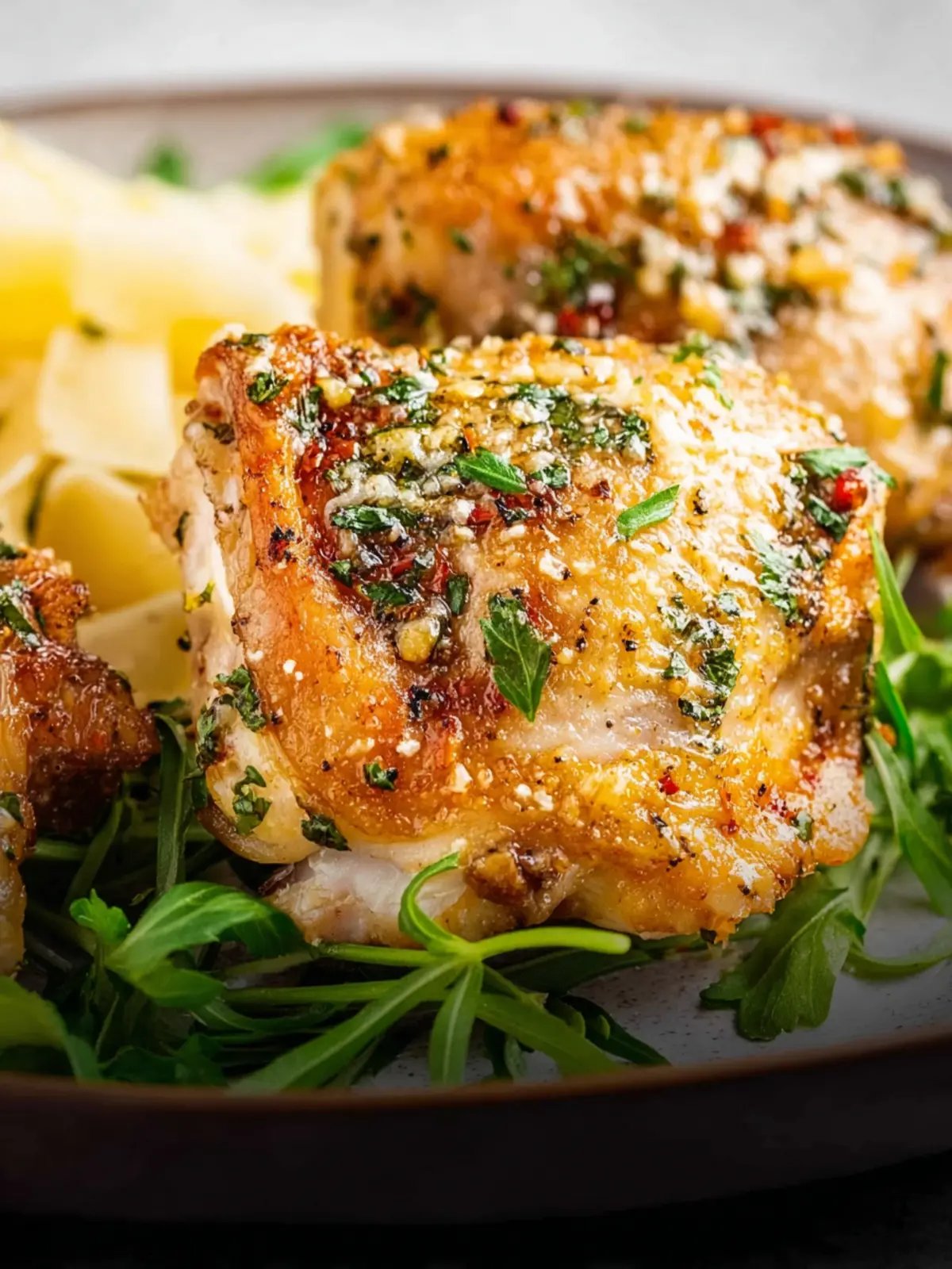 On a Rustic Platter: Create a stunning family-style meal by arranging the chicken thighs on a large platter, surrounded by fluffy mashed potatoes or creamy polenta. This adds a comforting touch to your dinner table.