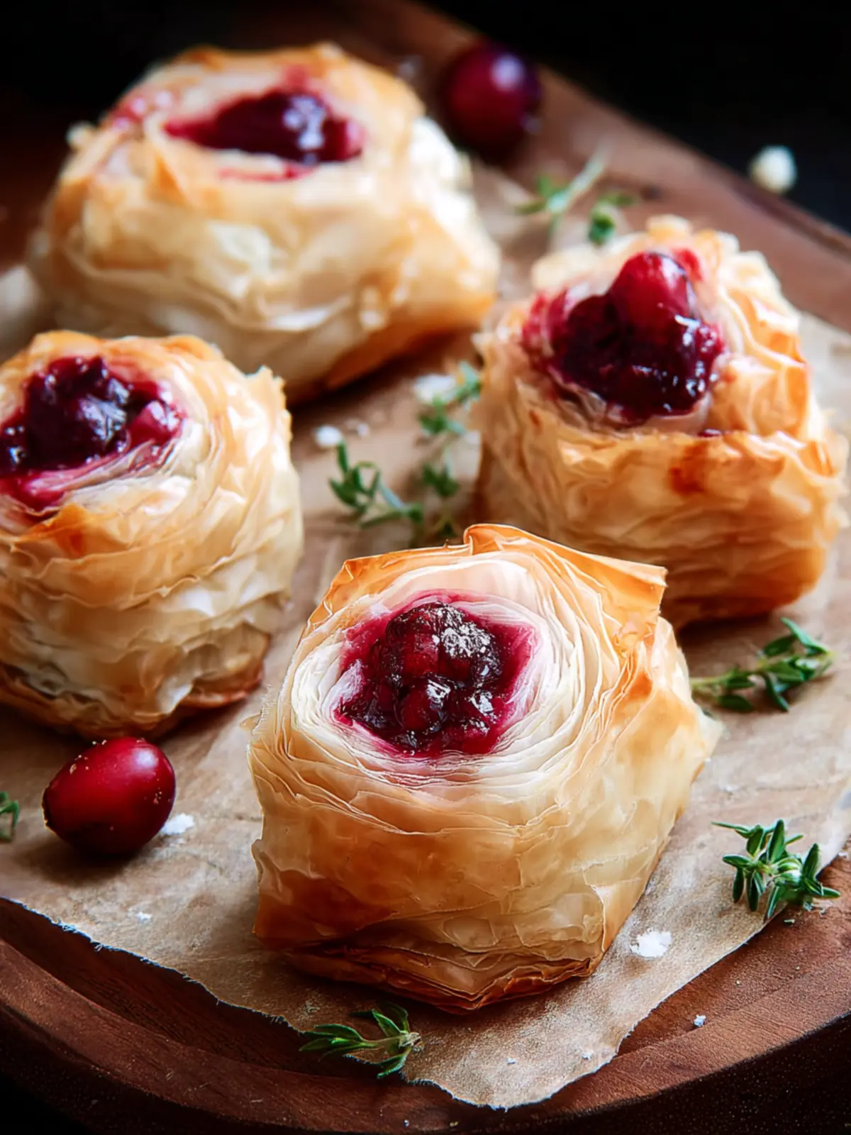 Consider substituting the cranberry with caramelized onions or roasted red peppers for a savory version. This twist allows you to enjoy the delicate phyllo pastry with an entirely different flavor profile, perfect for any occasion.