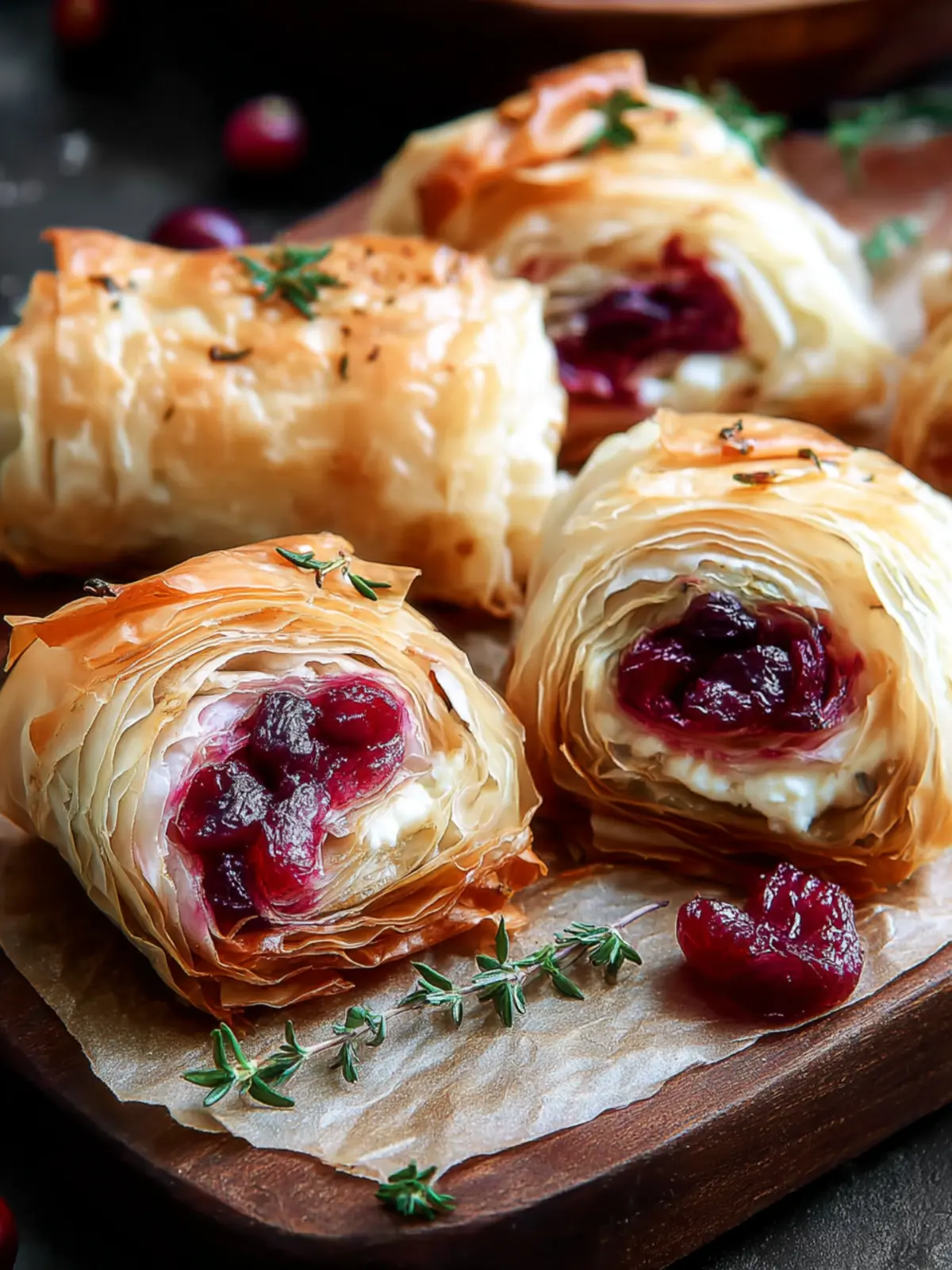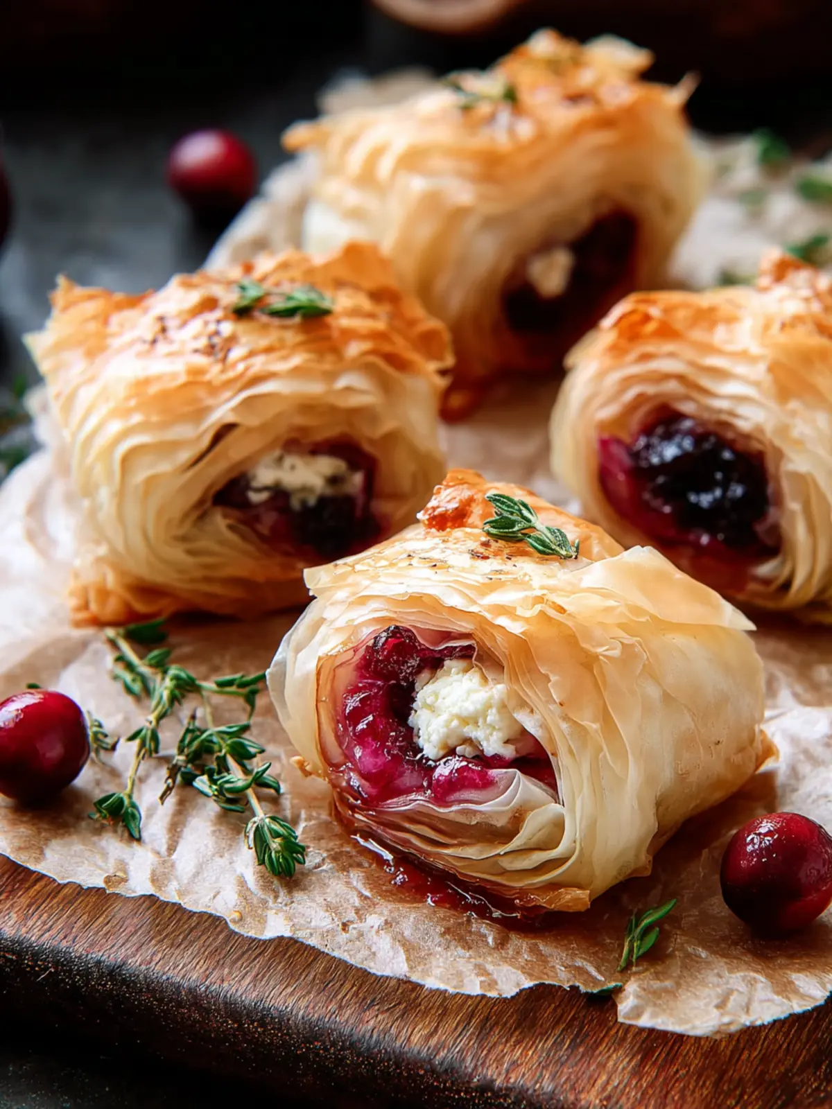 Deliciously flaky phyllo rolls filled with creamy goat cheese, tart cranberry sauce, and aromatic rosemary.