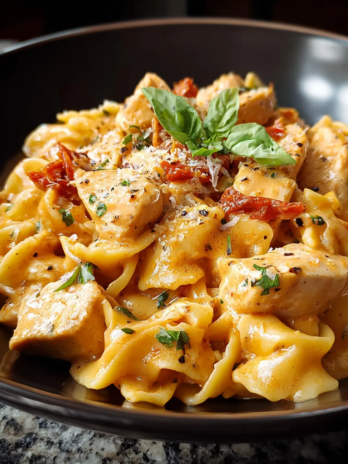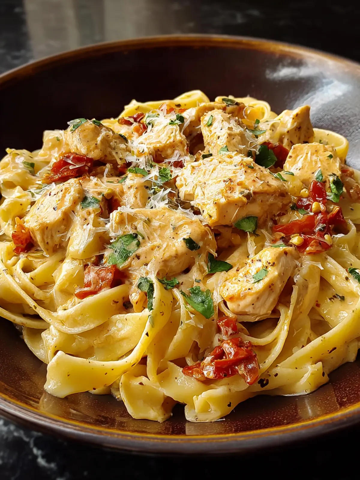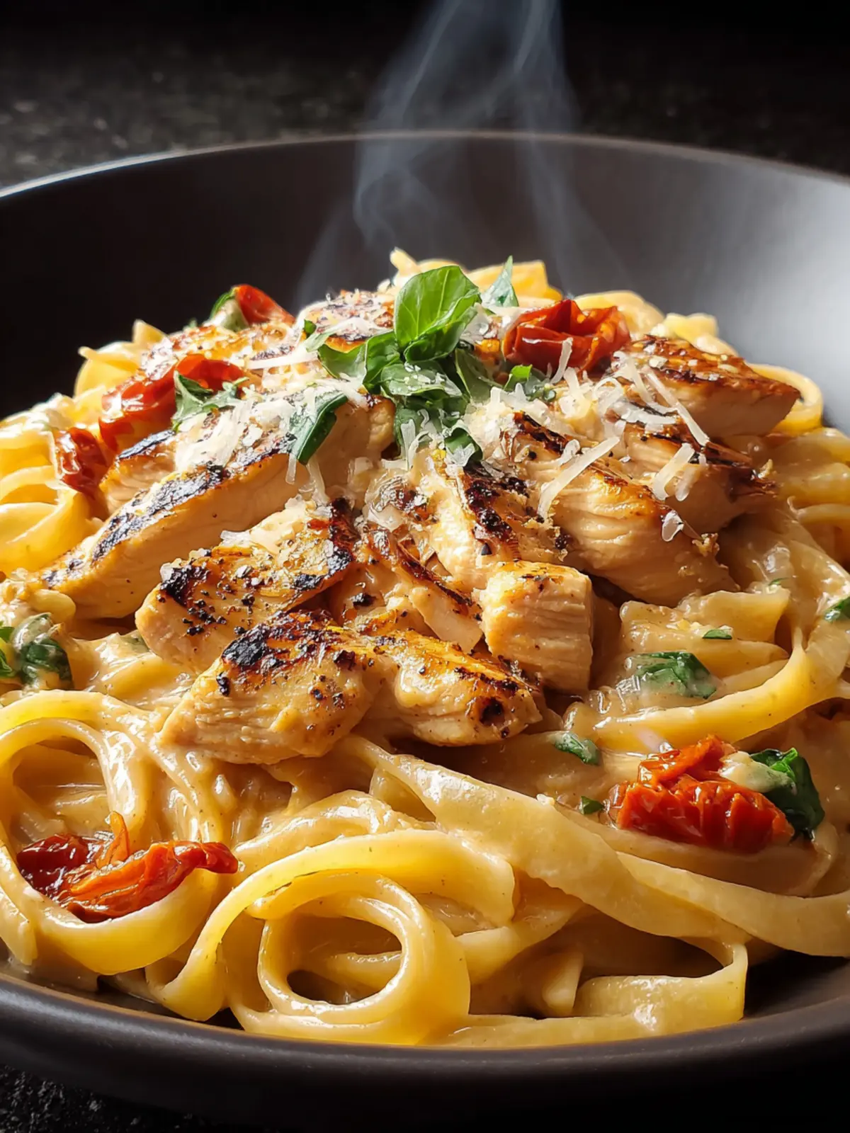 A delicious creamy garlic chicken pasta with sun-dried tomatoes and Parmesan cheese.