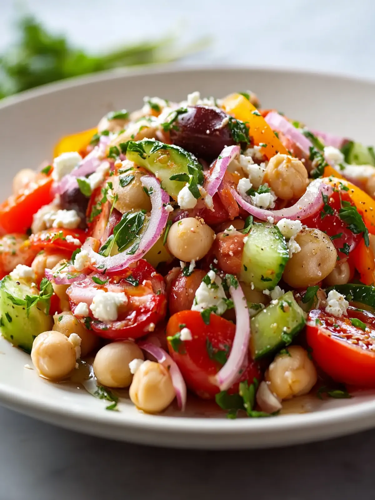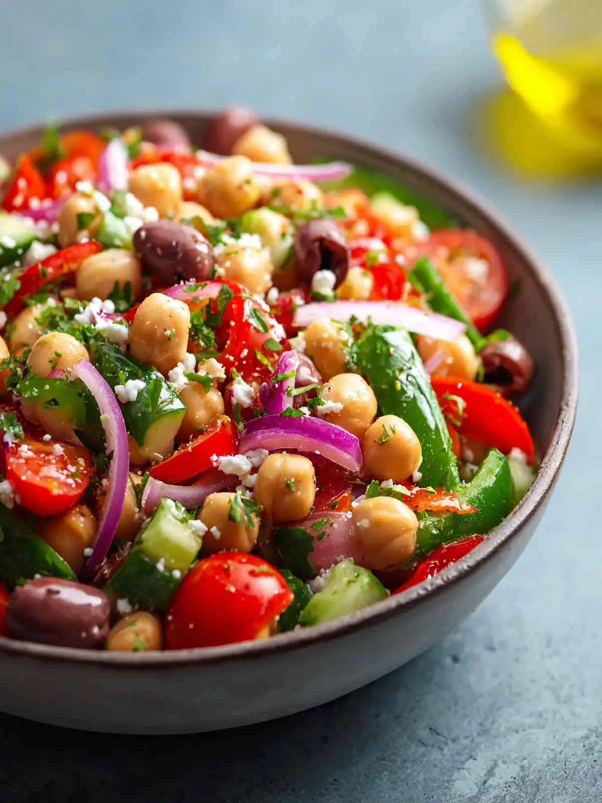 A fresh, crisp, and flavorful Mediterranean Bean Salad featuring chickpeas, bell peppers, and a tangy dressing.
