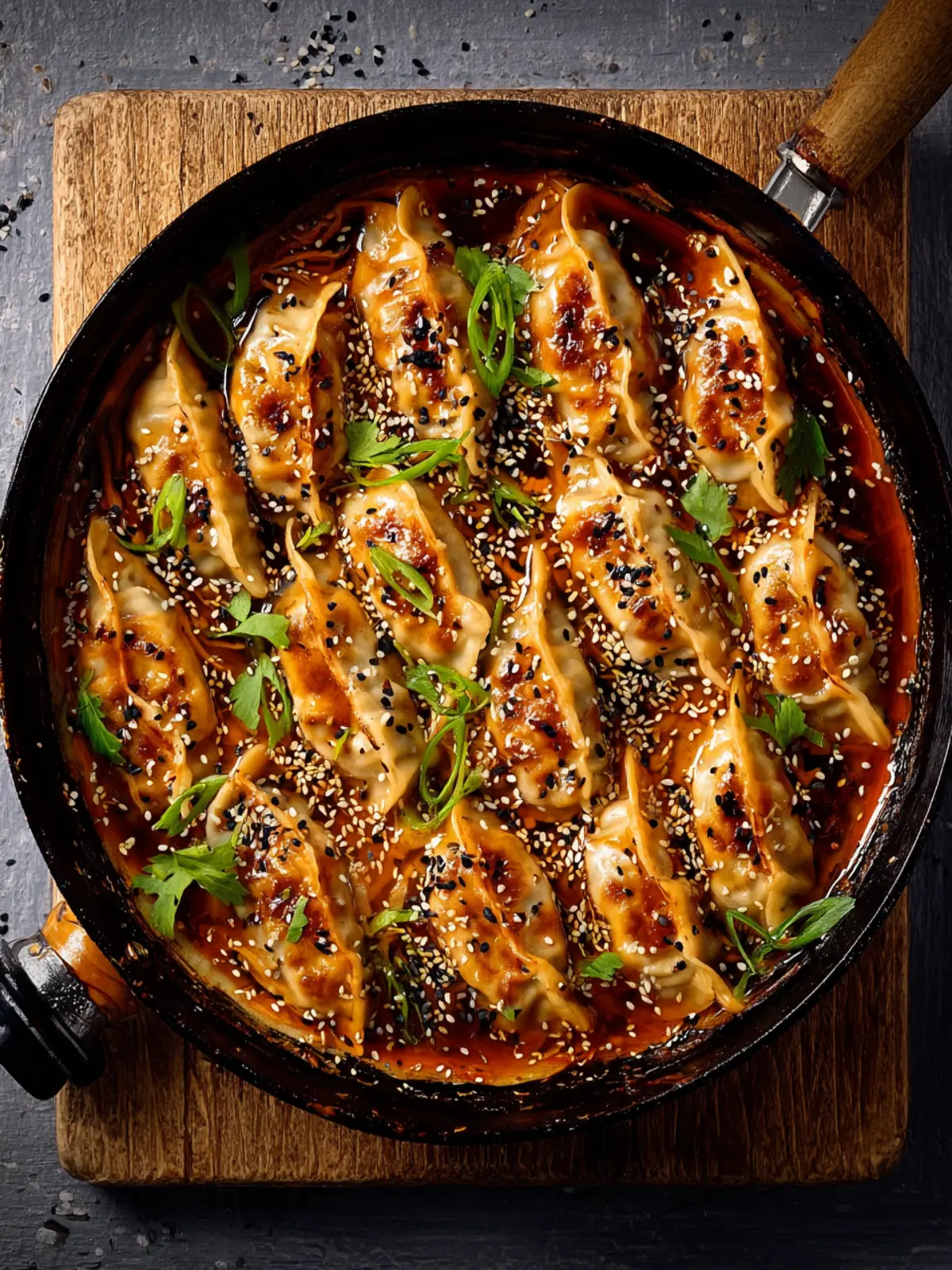 3. Arrange the dumplings (gyoza) into the sauce so that they’re partially submerged but the tops are sticking out of the sauce, then spoon a little of the sauce over each of the dumplings.